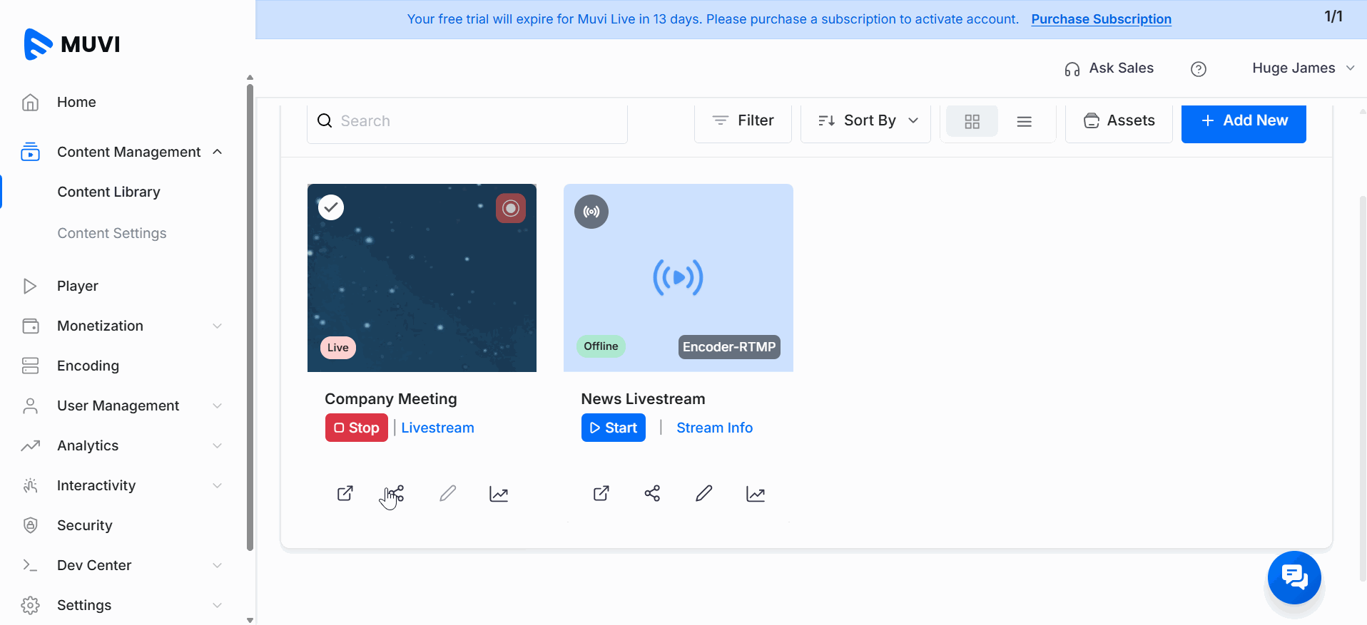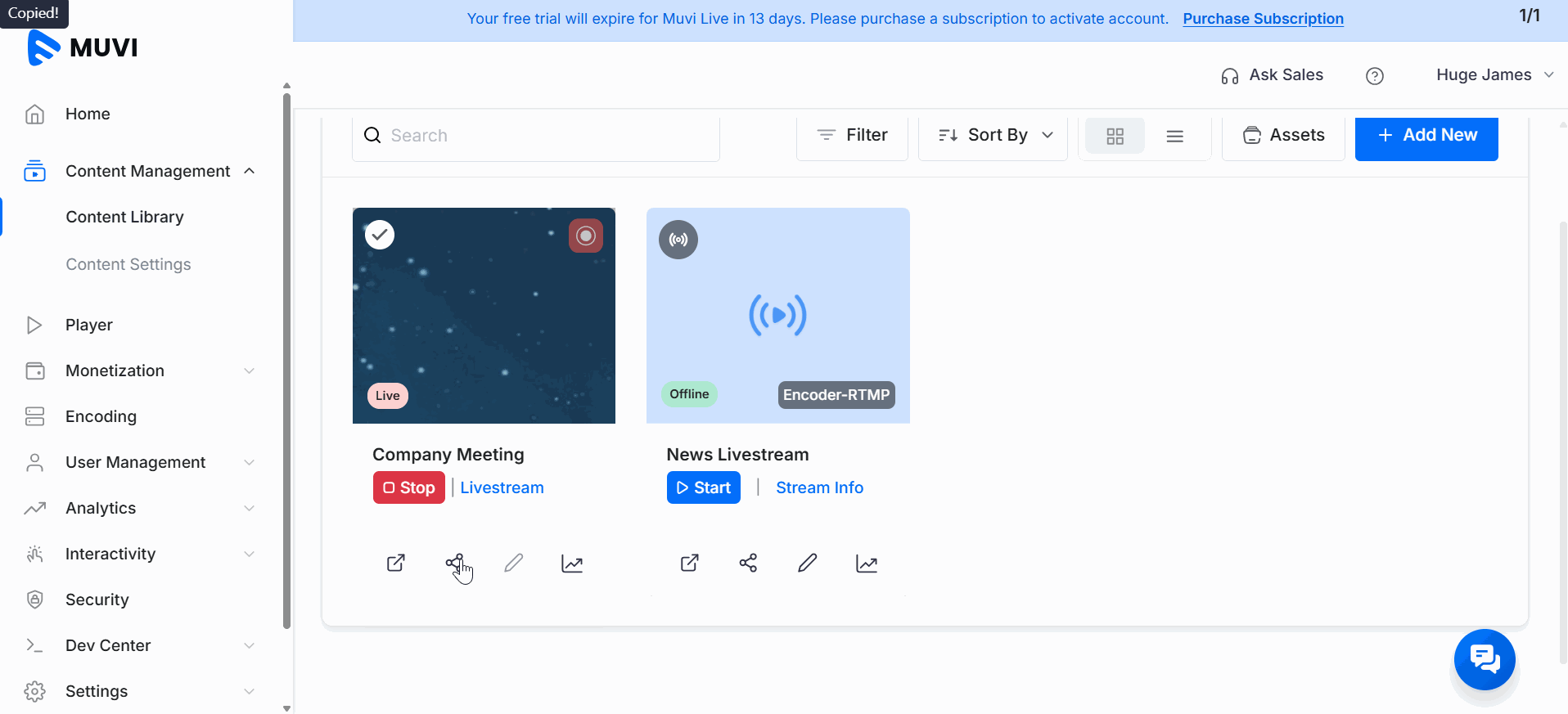 The Meetings feature in Muvi Live enables you to conduct two-way group video meetings and conferences. You can create multiple meetings, start/stop any meeting at any time, share the joining link of the meeting with multiple participants, and embed a join button in third-party websites.