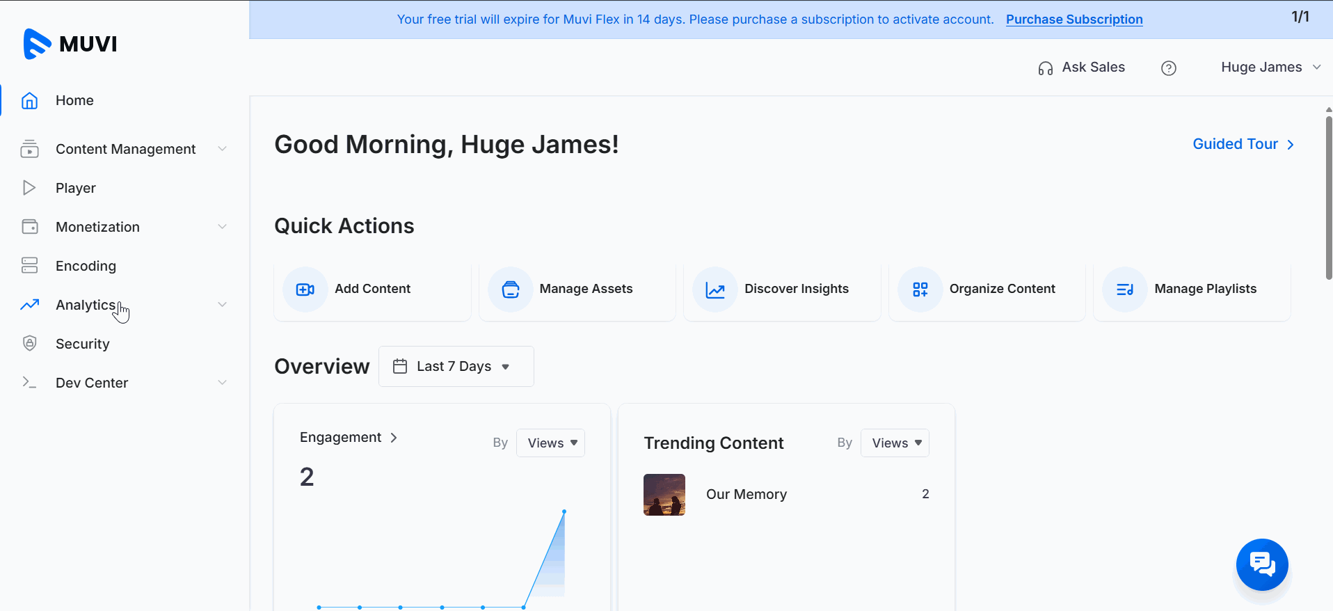 The Engagement Analytics shows the customized analytic report and graph of the number of videos watched, audios listened to, the number of hours videos watched, devices on which videos are watched, or audios are listened to, and more. You can watch the total Views breakdown by Content, User, Device Type, and Geography. Also, you can view the total watch duration breakdown by Content, User, Device Type, and Geography. The detailed report can be downloaded in CSV and/or XLSX format.