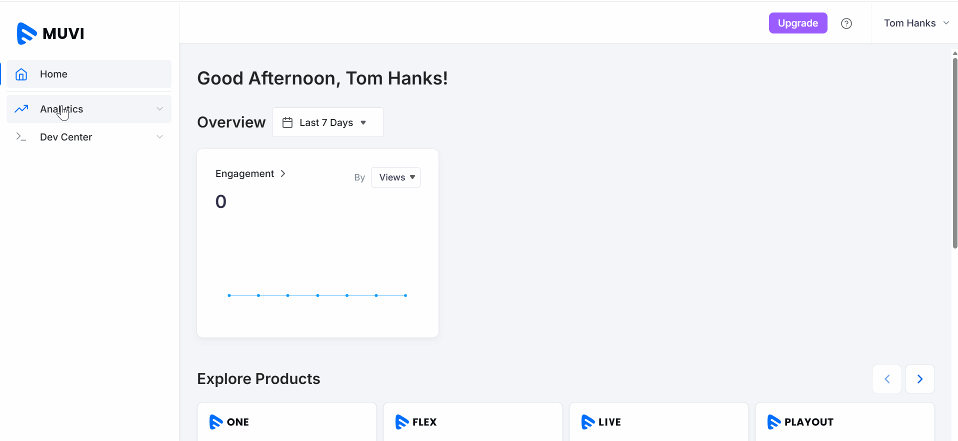 The Player Engagement Analytics provides detailed insights into how your users interact with your videos. You can track play behaviour, engagement patterns, and user activities directly from the Muvi Player. The analytics dashboard helps you monitor performance over different time ranges and export reports for further analysis.