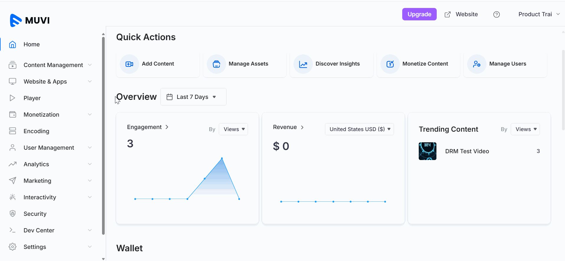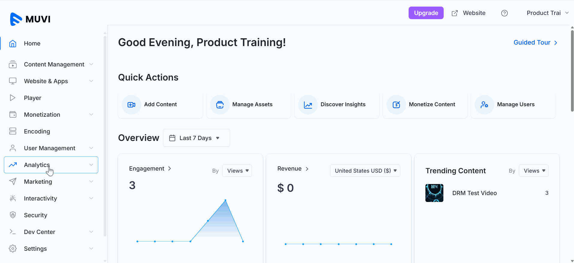 The Engagement section, located under the Analytics menu in the CMS, provides a customized analytics report and graphical representation of your end-user activity. You can track metrics such as the number of videos watched, audio streams played, total watch hours, and the devices used for viewing or listening. Additionally, engagement analytics are available on the CMS Dashboard, displaying key insights like Total Revenue, Content Views, and Total Watch Duration. You can also identify Trending Content based on view count and watch duration. For further analysis, a detailed report can be downloaded in CSV and/or XLSX format.