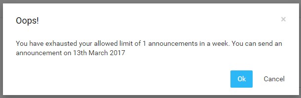 Note: You can only send one announcement email in a week from your CMS (e:g If you have sent an announcement on Thursday (9th August 2018), then you can send a new announcement next Monday (13th August 2018) and then again on next Monday (20th August 2018). If you wish to send more than one announcement email per week, you need to add a support ticket.