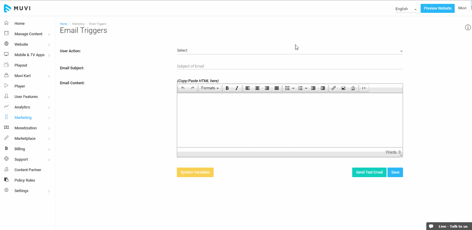 With our Email Triggers feature, you can send email notifications to your subscribers based on their various actions. You can send emails on “Welcome on Registration ", “Pay Per View Purchase”, “Payment Failure” etc. by setting up automated emails. This feature will be activated only after setting up the Payment Gateway, Subscription plans, PPV plan, and/or other monetization models. You can enable/disable email triggers according to your desire. You can also customize any email trigger as per your requirement by using the email editor or editing the HTML codes. You can also select/deselect the option to send a receipt attachment via email.