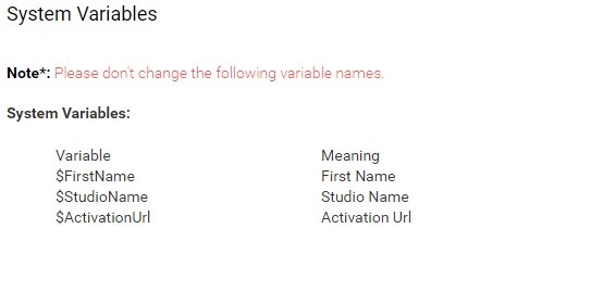 N.B. - Please DO NOT change the system variable names during creation of the email. Please refer the below screenshot for all system variables.