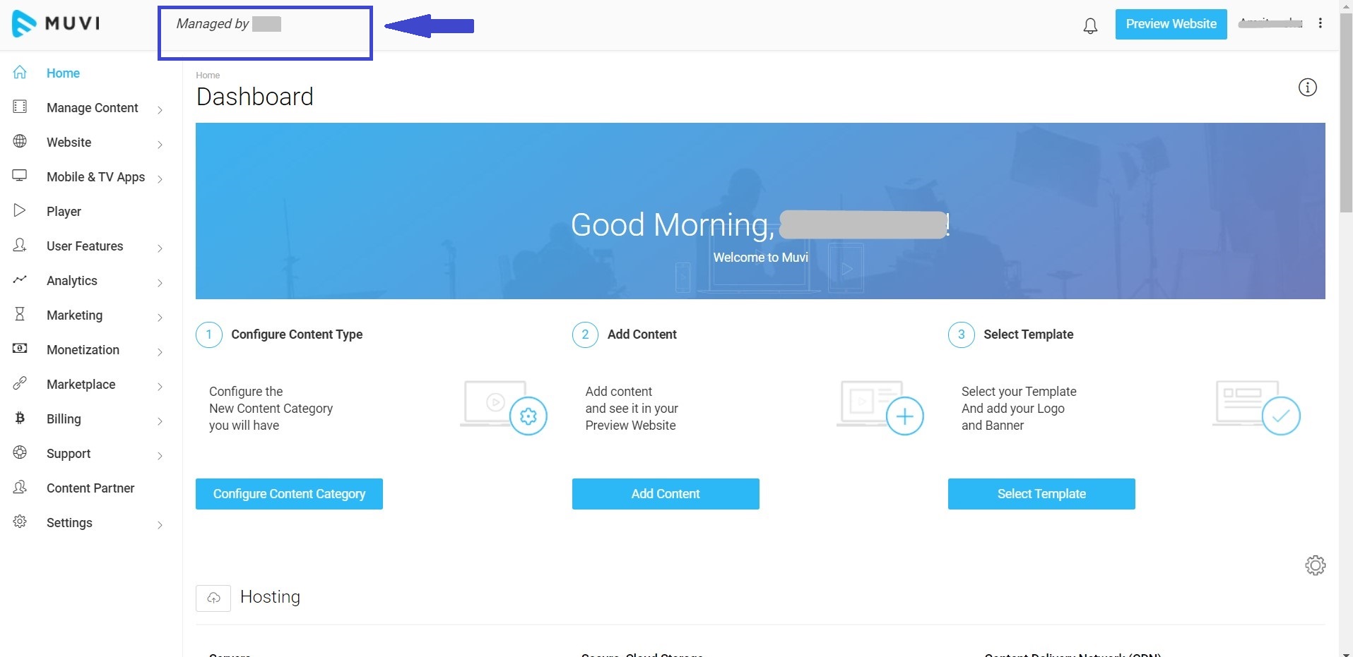 Instead of white labeling, we provide co-branding of the CMS in a reseller model. Where you can have your brand name on the Muvi CMS as “Muvi Managed by [Your Brand Name]” (see below screenshot).