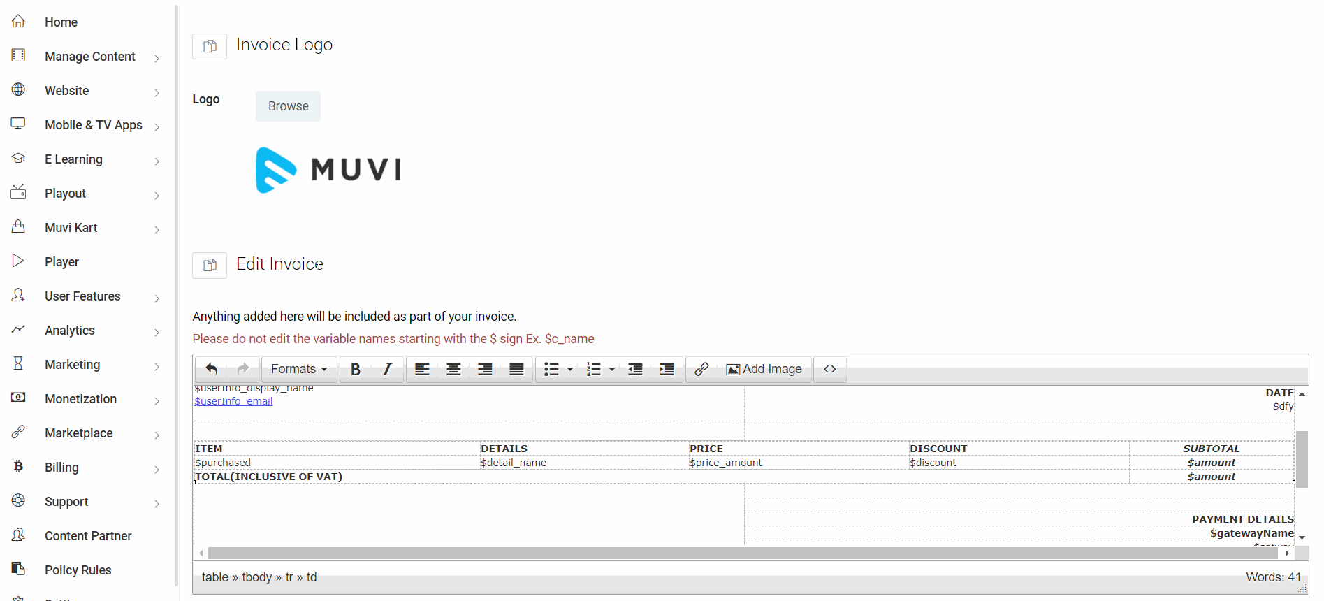 You can customize the invoice that you send to your users via Muvi CMS. You can edit the invoice title, add new column, format the text and add image. You can also add specific logo to your invoice.