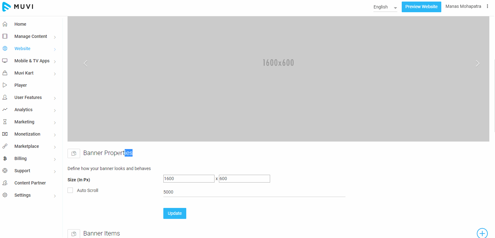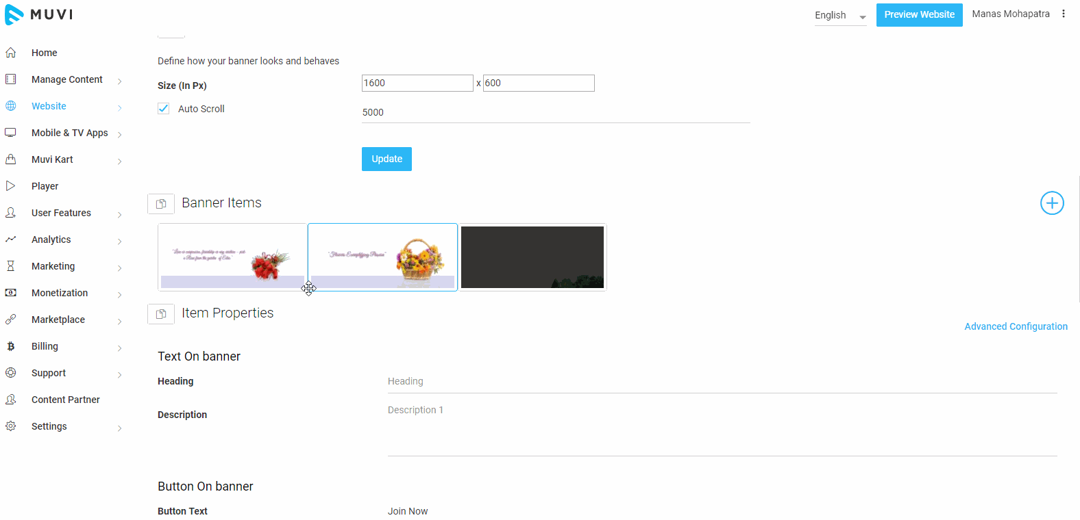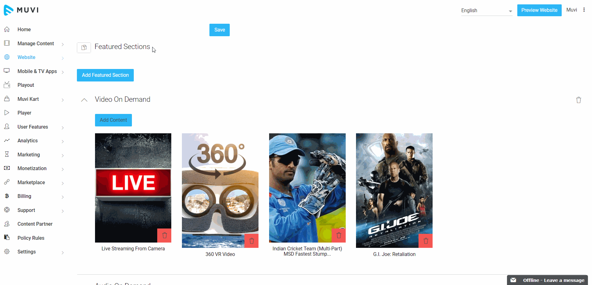 In the feature section, you can either manually add content that you want to show on your homepage or you can select the auto-generated option. For digital content, it will show the latest released movies or most-watched movies. For physical goods, it will display the goods that are in discount or show the new goods added to your website, etc.