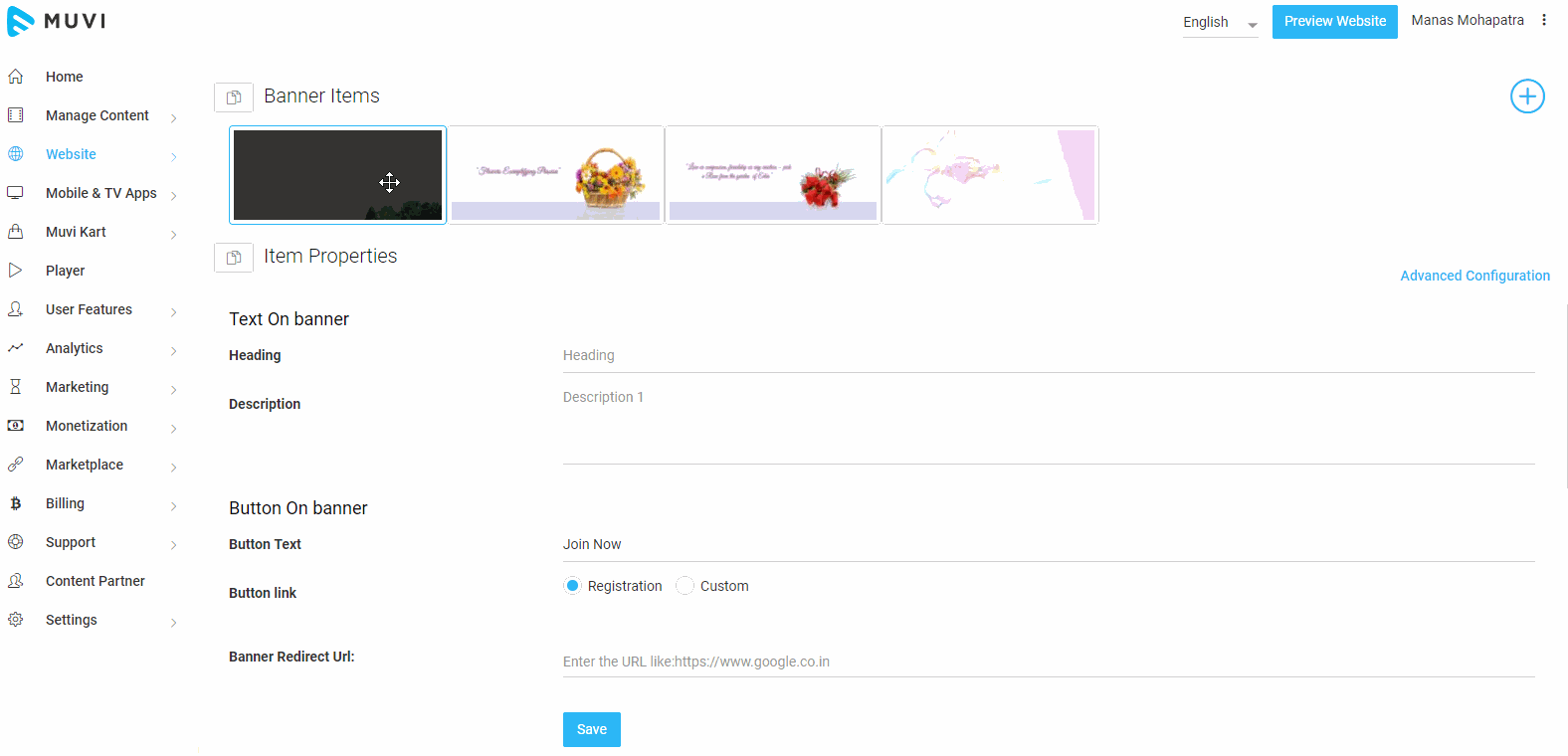 You can add text to any banner. This may be about your upcoming content, about any kind of promotion or advertisement about your website. You can add different texts to different banners including the video banners. There are two methods available to add text to banners. You can use the standard option or you can use the Advanced Configuration.