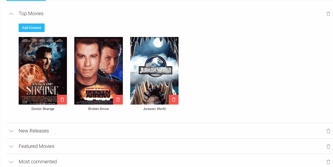 In the featured Section, there are more customizing options available. For example, you can shift the Feature Content to left or right depending on your preference. In order to change the position of the particular content you just need to drag the content and place it where you want. Likewise, you can also change the Feature Content section. You can simply drag and drop the sections at the position you want. To delete a particular feature section, simply click on the trashcan icon.